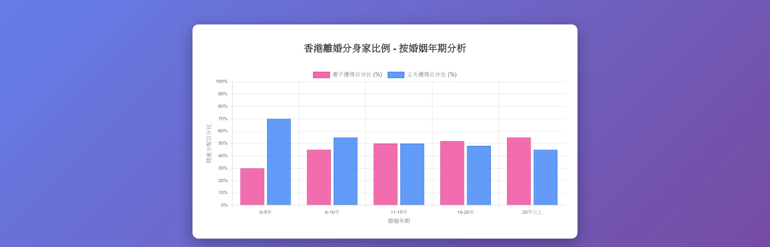 呢啲情況下,分財產嘅比例可能會傾斜畀需要多啲保障嘅一方。反而若果兩人結婚時間短、各自都有穩定收入,法庭通常會傾向「一人一半,乾淨利落」。